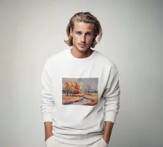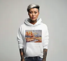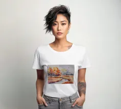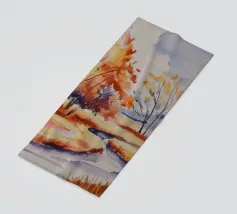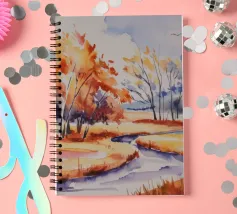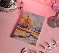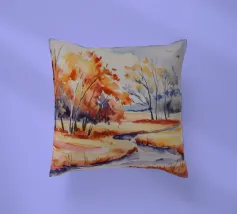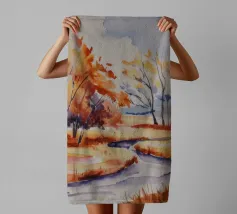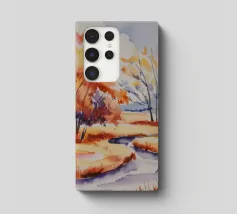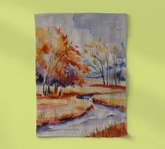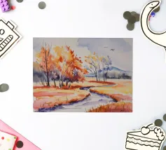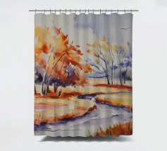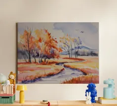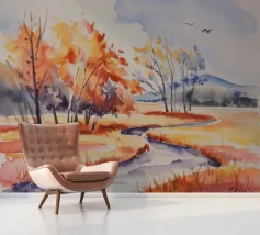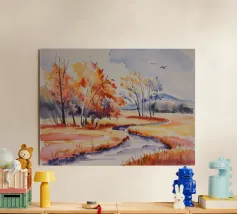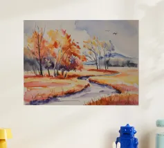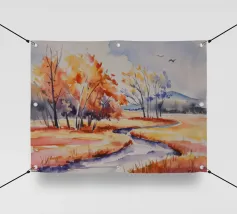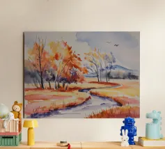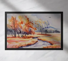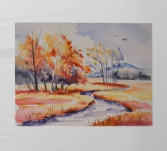 Un sereno paesaggio autunnale che raffigura un fiume che scorre dolcemente attraverso una campagna di alberi ornati da fogliame autunnale dorato e arancione, sotto un cielo morbido e vaporoso. Lo stile dell'acquerello esalta la qualità tranquilla e pittoresca della scena.