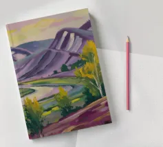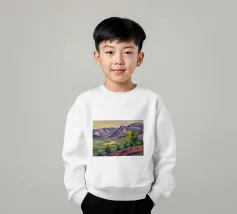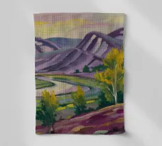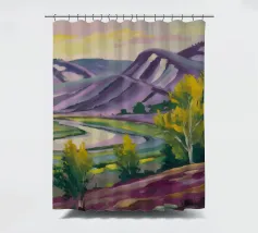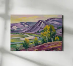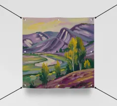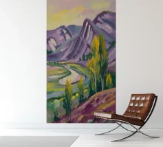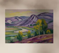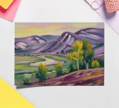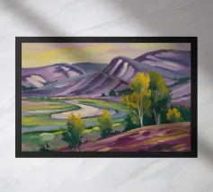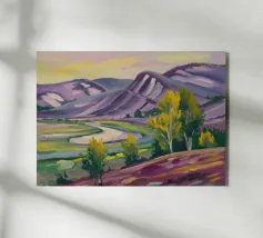 Un paesaggio pittoresco che mostra un fiume o una strada serpeggiante che scorre attraverso campi verdi e gialli, punteggiati da alberi stilizzati, che conducono verso lontane colline ondulate sotto un cielo morbido e nuvoloso.