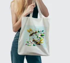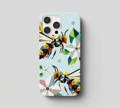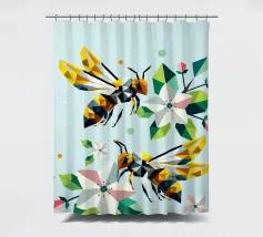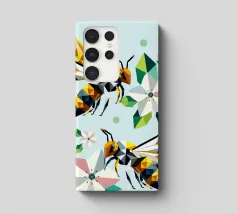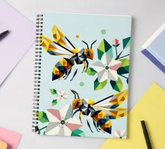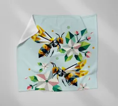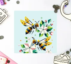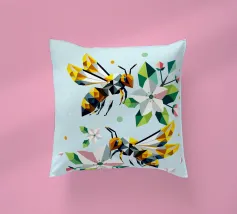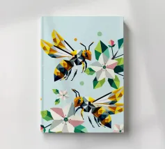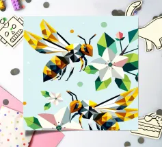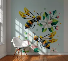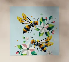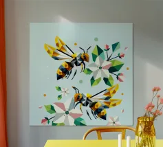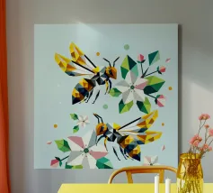 Due api dettagliate e dai disegni geometrici ronzano intorno a luminosi fiori di melo. La combinazione di colori vivaci e di forme sorprendenti irradia energia e vicinanza alla natura. Disegno geometrico con api e fiori di melo Colori vivaci in giallo, verde, bianco e rosa Composizione dinamica e piena di movimento Arte moderna e poligonale con motivi naturali Perfetto per gli amanti della natura e del design