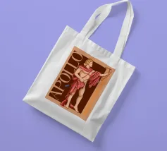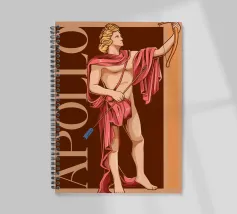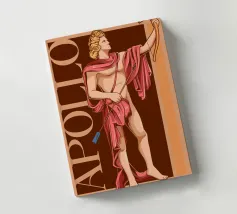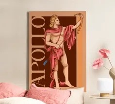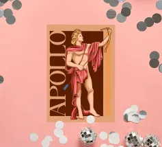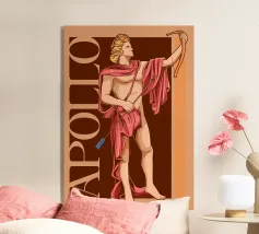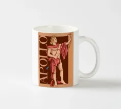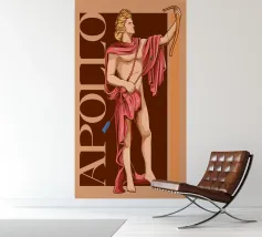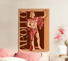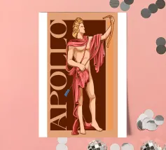 Apollo è in piedi, con un arco in una mano e una freccia nell'altra. La sua postura è fiera e tranquilla. La combinazione di colori nei toni del rosa e del marrone conferisce all'immagine calore e classicità. Le scritte verticali sottolineano la sua autorità.