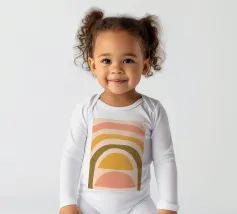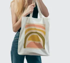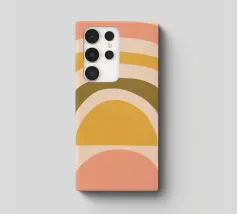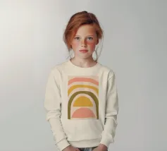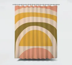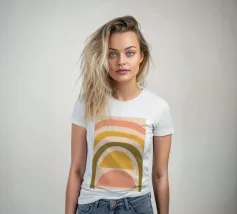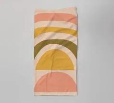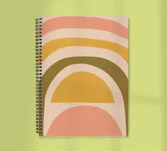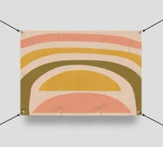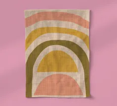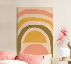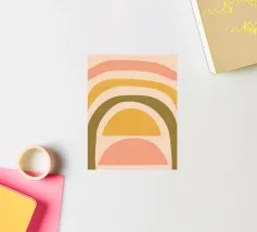 Questa immagine mostra un'illustrazione astratta di un arcobaleno con colori tenui. L'arcobaleno è composto da bande curve nei toni del rosa, del giallo e del verde, creando un design minimalista e moderno.
