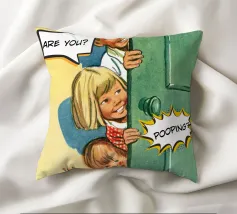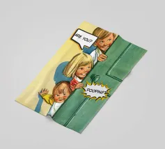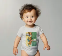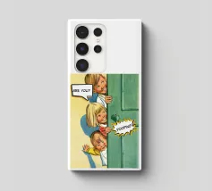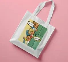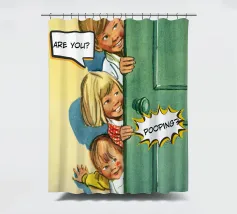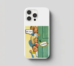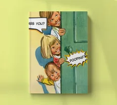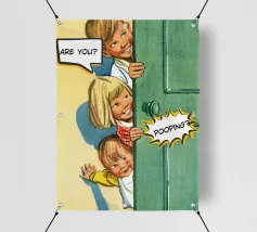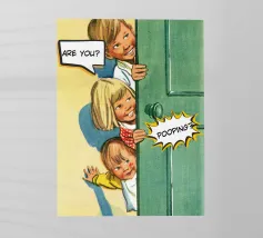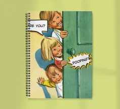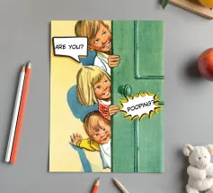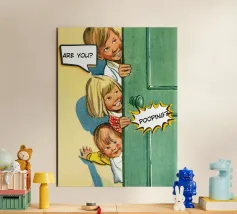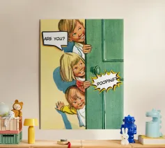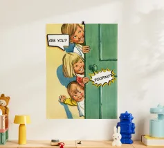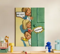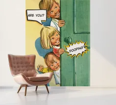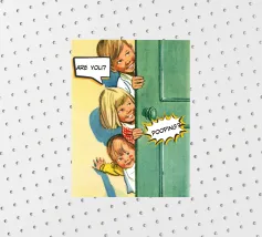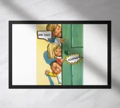 Tre bambini sbirciano scherzosamente da una porta, con bolle di dialogo che aggiungono umorismo alla scena. Le loro espressioni suggeriscono curiosità e divertimento.