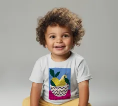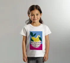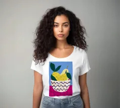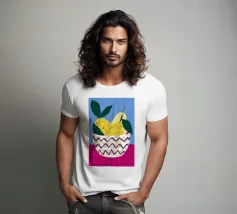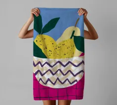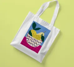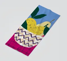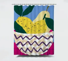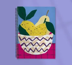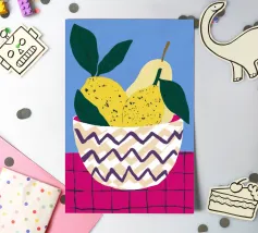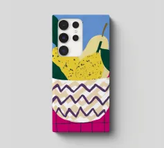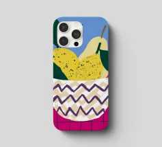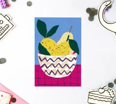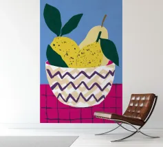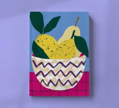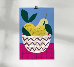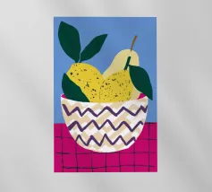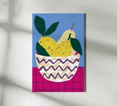 Due pere gialle sono adagiate in una ciotola rosa e bianca con motivi a zig-zag, con uno sfondo giallo e scuro che crea una natura morta grafica e ad alto contrasto.