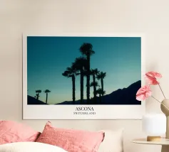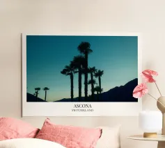 Ascona, adagiata lungo le rive del Lago Maggiore, è il gioiello più meridionale della Svizzera, dove le palme incontrano le sagome alpine. Questa fotografia cattura il fascino tranquillo del cielo serale dietro le iconiche palme, evocando un'atmosfera sognante e mediterranea. Un pezzo perfetto per chi desidera le notti d'estate, la pace del lago e un tocco di eleganza svizzero-italiana sulle proprie pareti.