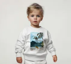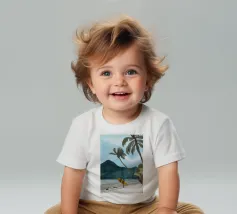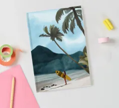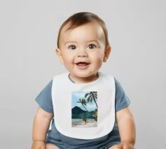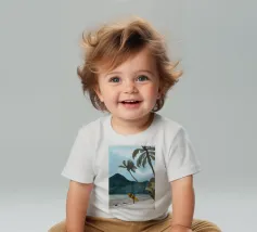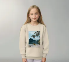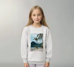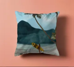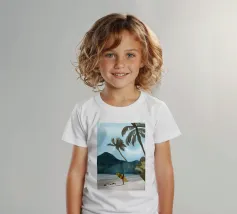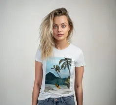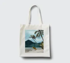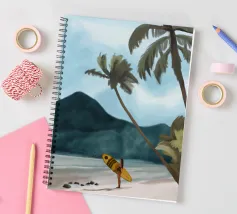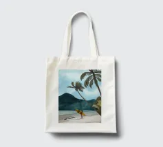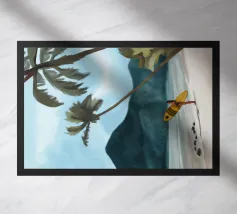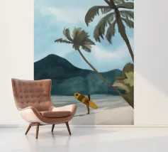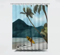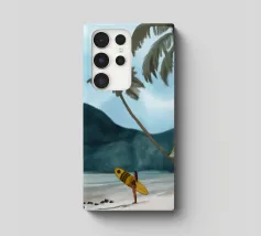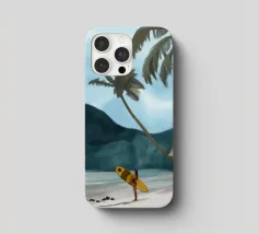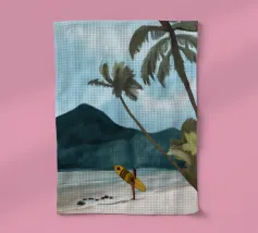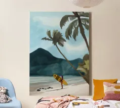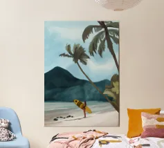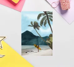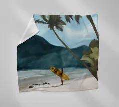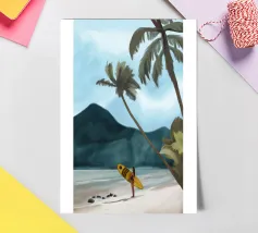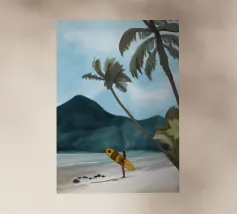 Questo dipinto digitale raffigura una serena scena di spiaggia tropicale in cui una surfista si trova a piedi nudi sulla sabbia bianca, con in mano una tavola da surf giallo brillante. Guarda l'oceano calmo, in attesa dell'onda perfetta. Palme imponenti incorniciano la composizione, mentre sullo sfondo si ergono lussureggianti montagne verde scuro sotto un cielo azzurro parzialmente nuvoloso. L'opera evoca un'atmosfera pacifica e avventurosa, ideale per gli amanti del surf, dei viaggi e dei paesaggi costieri. Le pennellate pittoriche e la tavolozza di colori tenui evidenziano la tranquillità e la bellezza naturale di un paradiso tropicale.