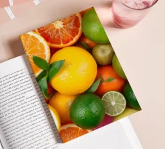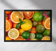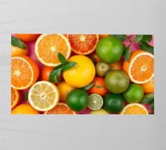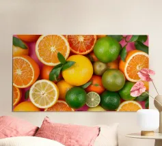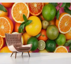 Limoni, lime, arance e pompelmi vivaci sono disposti ad arte con foglie verdi su uno sfondo rosa, creando una composizione vibrante e rinfrescante.