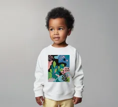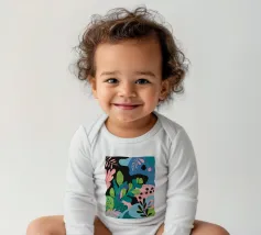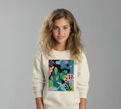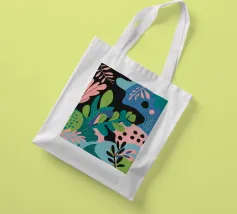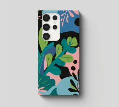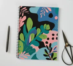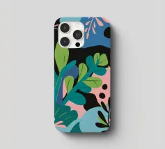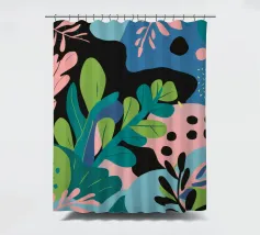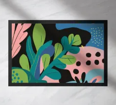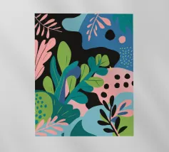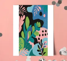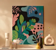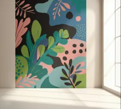 Un'opera d'arte astratta giocosa e colorata presenta forme botaniche, foglie e pois in una composizione vivace, creando un'opera d'arte moderna gioiosa ed energica.