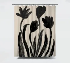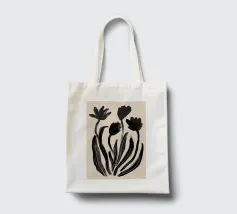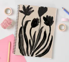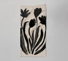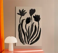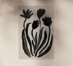 Un'opera d'arte astratta di grande impatto, con fiori neri stilizzati e fogliame su un morbido sfondo beige, perfetta per un'estetica moderna o minimalista.