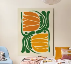 Due forme floreali stilizzate si dispiegano in un apparente riflesso: una celebrazione delle forme organiche: Questa composizione combina l'eleganza dell'Art Nouveau con la riduzione scandinava. I toni caldi dell'arancione e del giallo contrastano con il verde bosco su uno sfondo color crema. Le linee curve e gli elementi a goccia ricordano gli ornamenti dell'Art Nouveau e le serigrafie contemporanee. Ispirata alle forme naturali, l'opera crea un equilibrio meditativo tra dinamismo e tranquillità. Perfetto per gli amanti dei motivi botanici con un tocco moderno. Decorativo, senza tempo e pieno di energia.