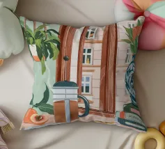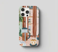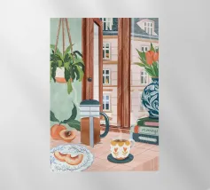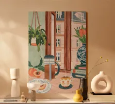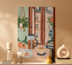 finestra libri caffettiera piante pesca tazzina da caffè tulipani tazza da tè scaffale di libri pesche a fette vaso di fiori vista dell'edificio tavolo bevanda calda finestra aperta vaso di ceramica mattine pianta appesa vista interna tavolo in legno