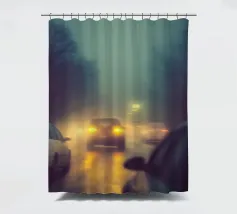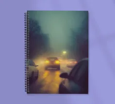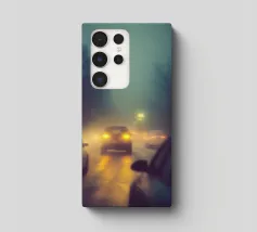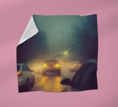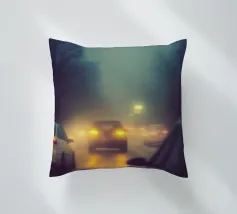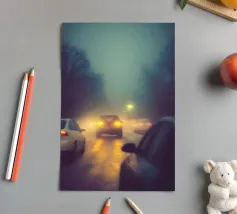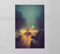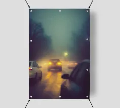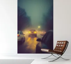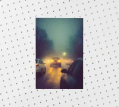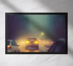 I fari delle auto trafiggono una fitta nebbia, creando un'opera malinconica e coinvolgente, ideale per gli amanti dei paesaggi urbani.