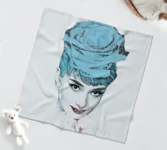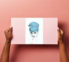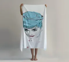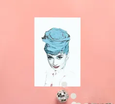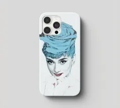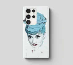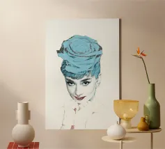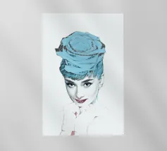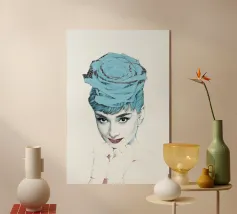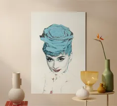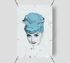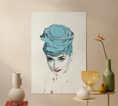 Collage di ritratti artistici di Audrey Hepburn in toni blu e tenui su sfondo bianco.