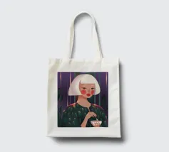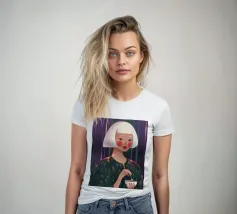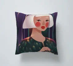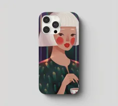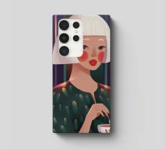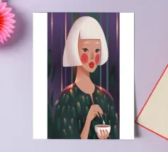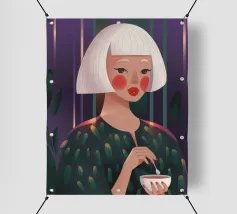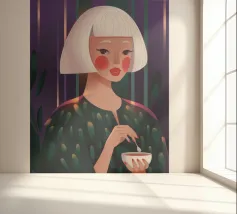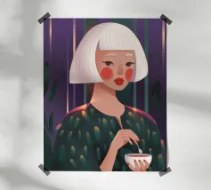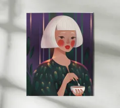 Il dipinto raffigura una persona con i capelli corti e bianchi, che tiene in mano una tazza, su uno sfondo viola intenso con foglie verdi. I toni rilassanti evocano un'atmosfera contemplativa e pacifica.