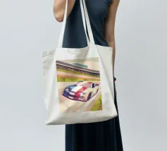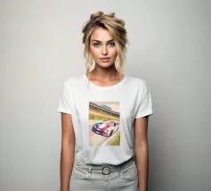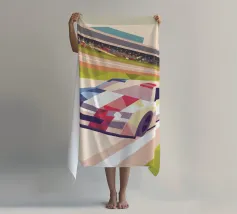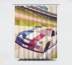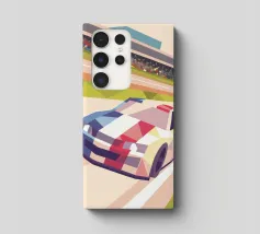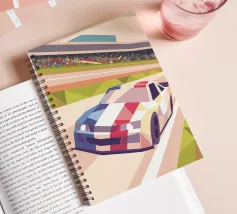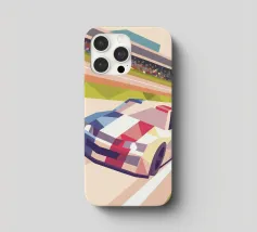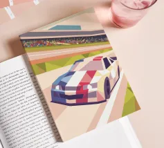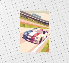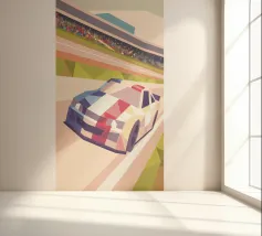 Illustrazione di un'auto da corsa in pista con uno stile geometrico moderno.