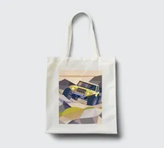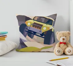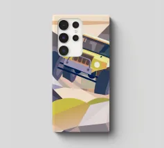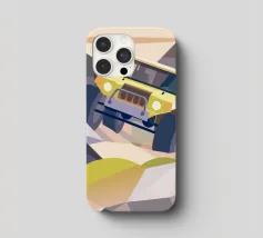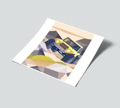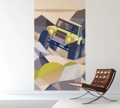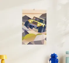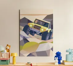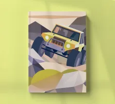 Illustrazione di un'auto fuoristrada su un terreno roccioso con uno stile geometrico moderno.
