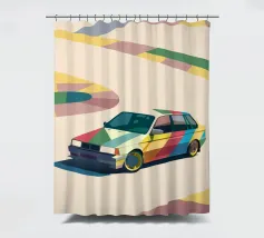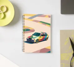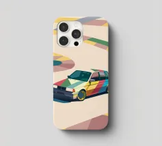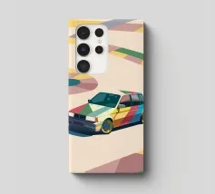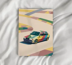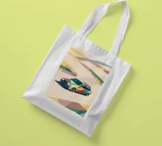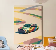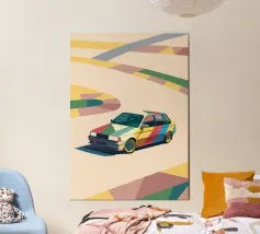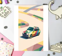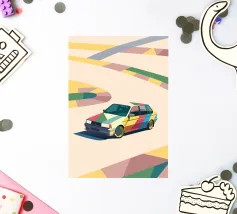 Illustrazione di un'utilitaria colorata sulla strada con uno stile geometrico moderno.