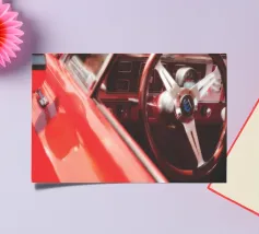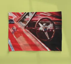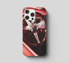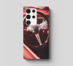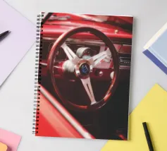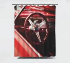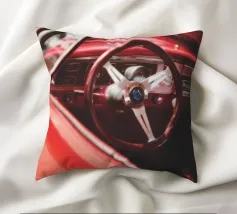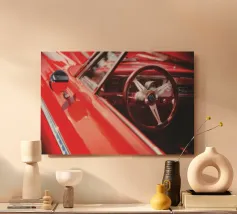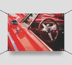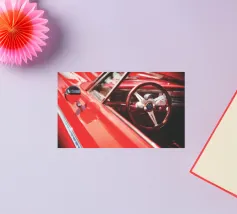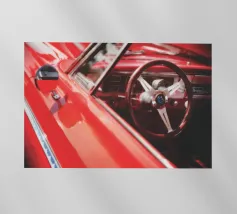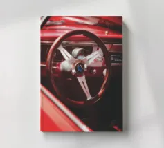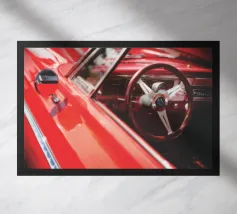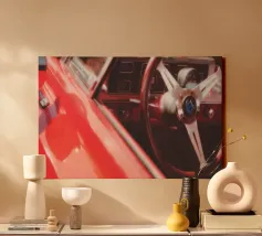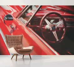 Gli interni, il volante e il cruscotto di un'auto d'epoca americana di colore rosso