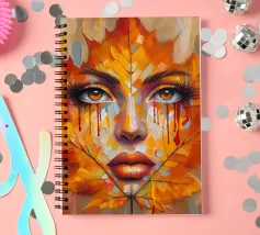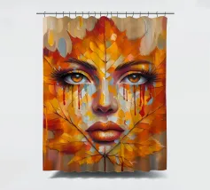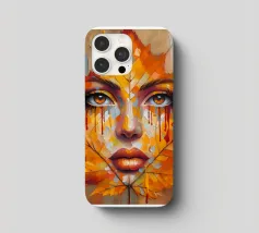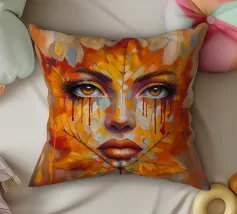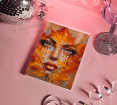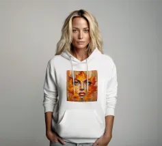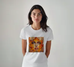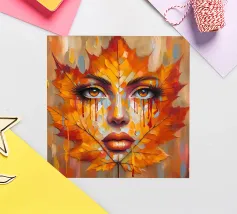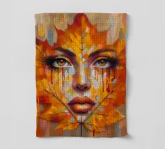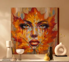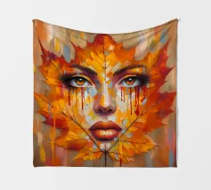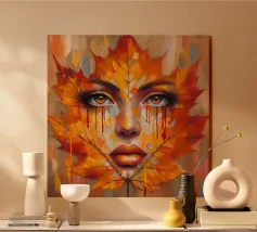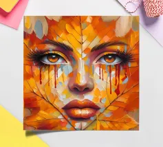 Ritratto in una composizione artistica di grande impatto, in cui il volto di una donna si mescola senza soluzione di continuità con le vibranti foglie autunnali. Le foglie, principalmente nelle tonalità dell'arancio, del giallo e del rosso, formano i contorni del viso della donna, creando un effetto simile a una maschera.