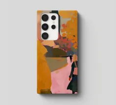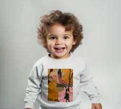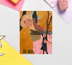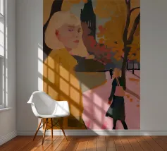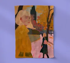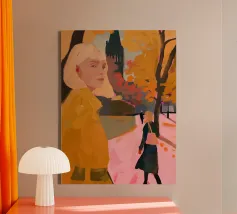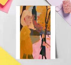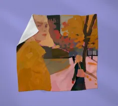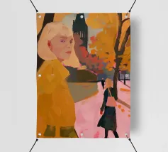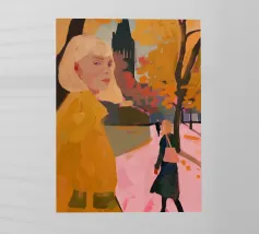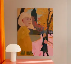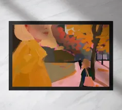 Un dipinto stilizzato di una strada parigina in autunno, con alberi dorati, toni rosa tenui e figure che camminano nella scena.