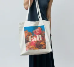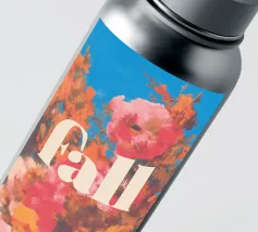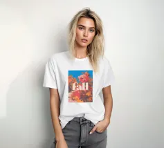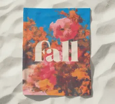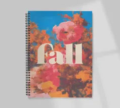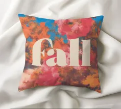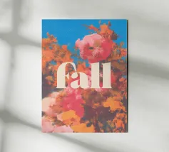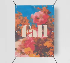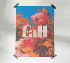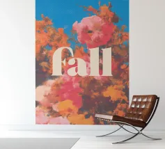 Questa moderna opera d'arte in stile autunnale presenta il testo "Fall" (Autunno) in caratteri cubitali bianchi su uno sfondo astratto di fogliame arancione e fiori rosa. Con un mix di elementi botanici e una superficie strutturata, l'illustrazione trasmette una calda atmosfera autunnale, ideale per gli amanti del testo. Il cielo azzurro crea una combinazione armoniosa di natura e arte.