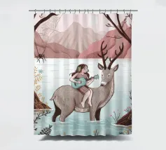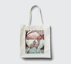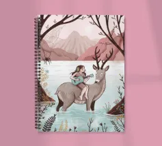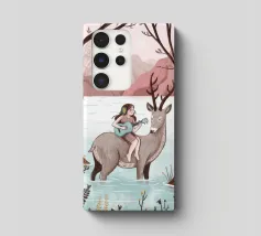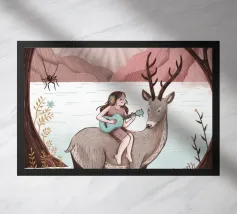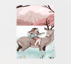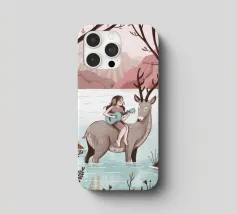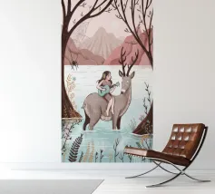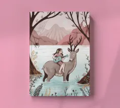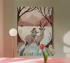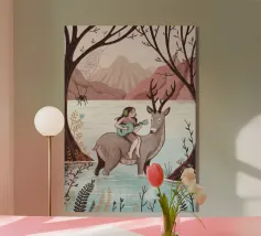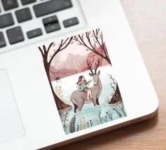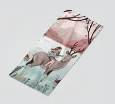 Un cavaliere intraprende un viaggio in cima a un maestoso cervo attraverso un paesaggio innevato. Le montagne lontane scintillano sotto un fresco cielo crepuscolare, evocando avventura e tranquillità.