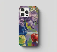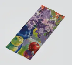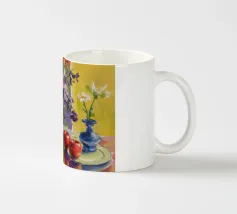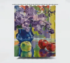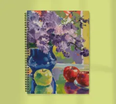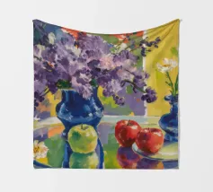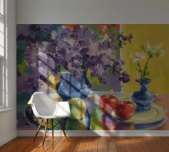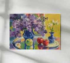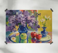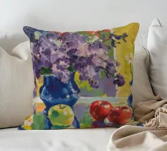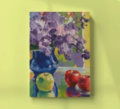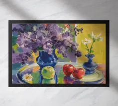 Una vivace composizione di natura morta con profumati lillà viola in un vaso blu intenso, accanto a un vaso blu più piccolo, mele verdi e limoni gialli, il tutto su un allegro sfondo giallo.