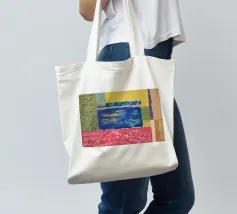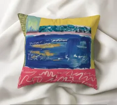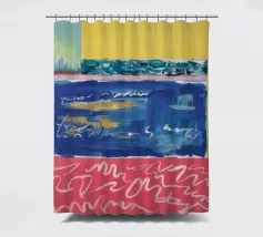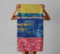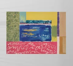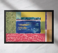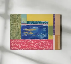 Un paesaggio astratto minimalista con una forma rettangolare blu intenso e strutturato che rappresenta l'acqua o un panorama lontano, contrapposta a una distesa giallo pallido, divisa da una sottile linea orizzontale che suggerisce un orizzonte tranquillo.