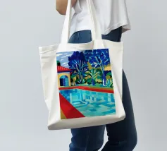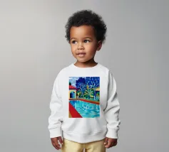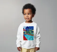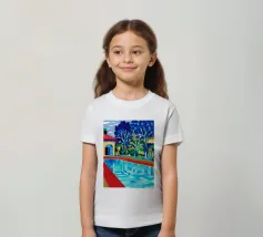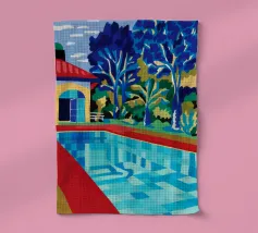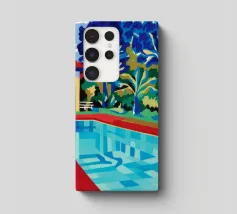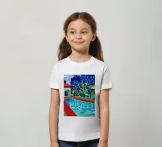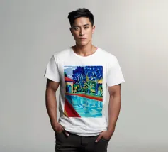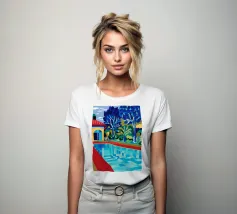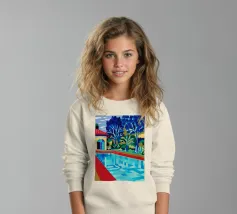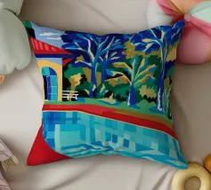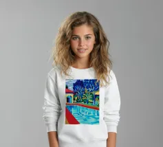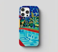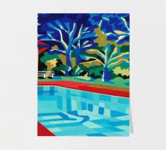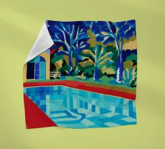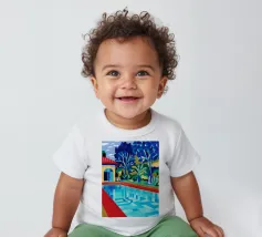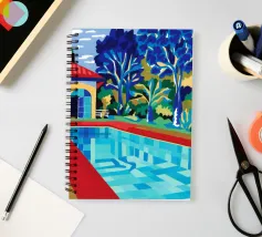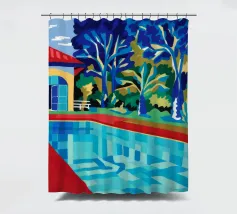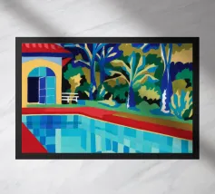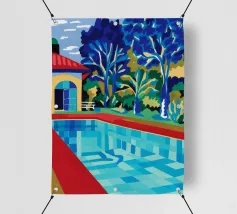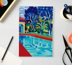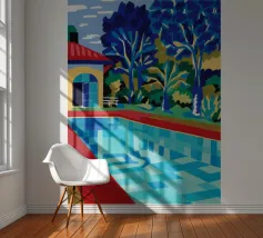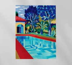 Scena illustrativa di una lussuosa piscina dall'acqua limpida e azzurra, circondata da alberi verdi e lussureggianti, da un edificio con tetto in terracotta e da arredi a bordo piscina, che evocano uno svago sereno e di alto livello.