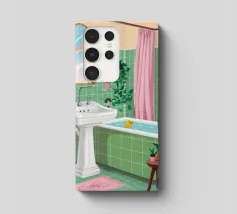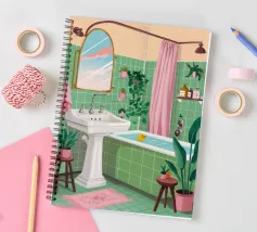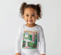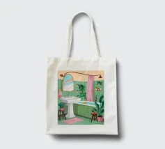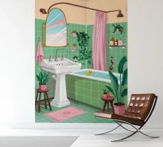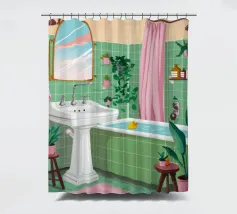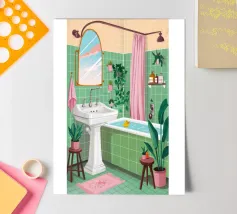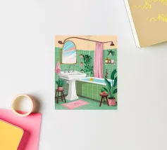 Una bella illustrazione di un bagno con piastrelle verdi, uno specchio decorato, un lavandino e piante rigogliose. La scena è elegante, fresca e ha un fascino sereno, simile a quello di una spa, di ispirazione vintage.
