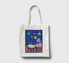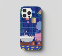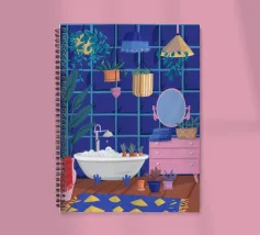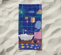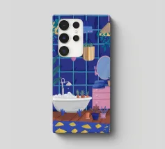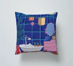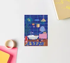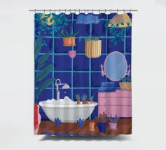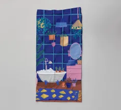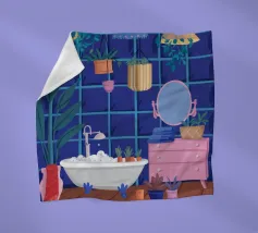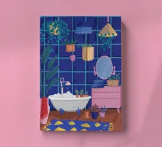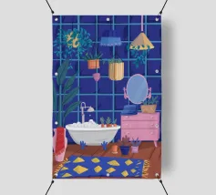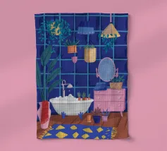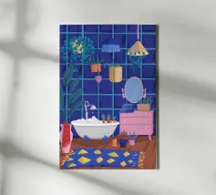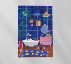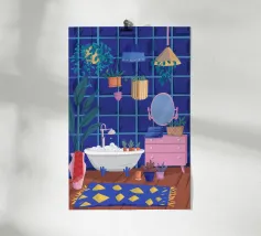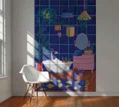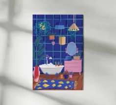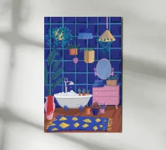 Un bagno riccamente blu con piante, specchio e tappeto a motivi evoca un profondo comfort e un rituale.