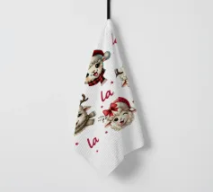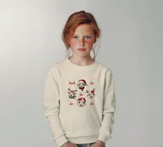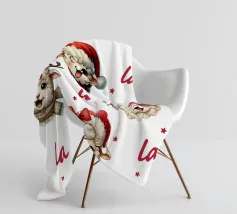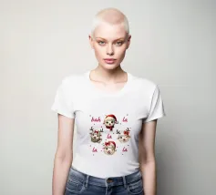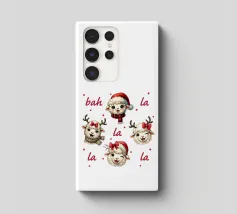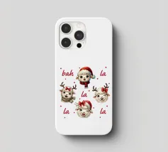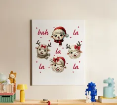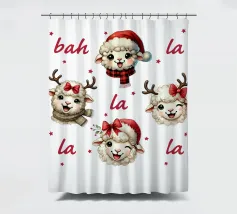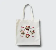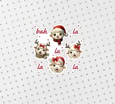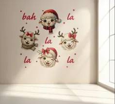 Quattro simpatiche pecore con accessori festivi, tra cui corna di renna e cappelli da Babbo Natale, sono circondate dalle parole "bah" e "la" in rosso.