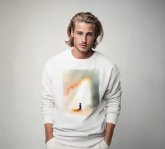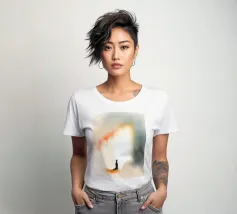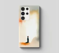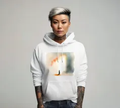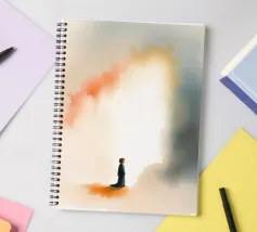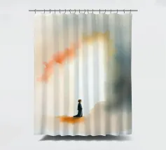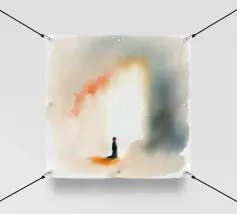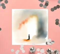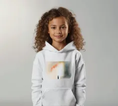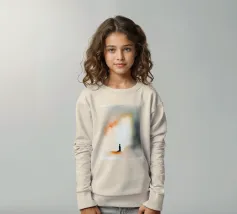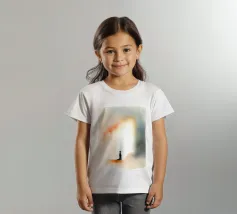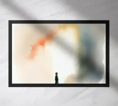 Un bambino in abiti scuri è immobile in un ambiente mistico, di fronte a un gradiente di colore che contrasta con la nebbia ombrosa. La scena è tranquilla e allo stesso tempo profonda, e suscita un pensiero profondo.