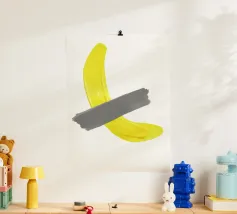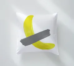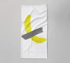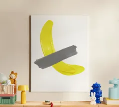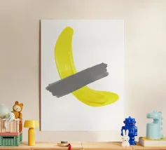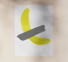 Un tratto giallo audace e curvo attraversa la tela, intersecato da una striscia grigia orizzontale. I colori contrastanti creano una composizione suggestiva e minimalista.