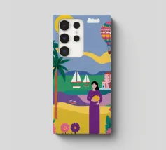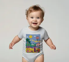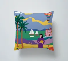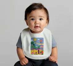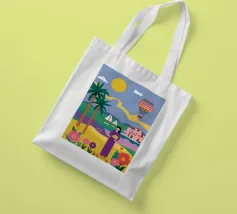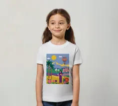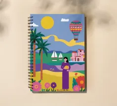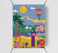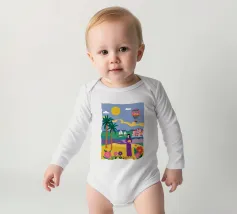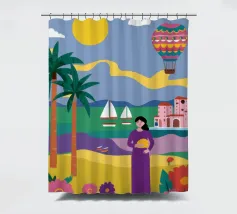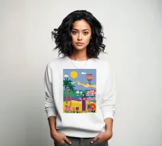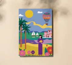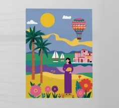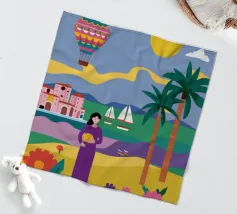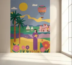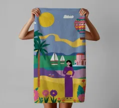 Una scena di spiaggia vivace e stravagante con una mongolfiera colorata che fluttua in un cielo soleggiato. Una persona si rilassa su una coperta sulla sabbia, creando una rappresentazione idilliaca, gioiosa e leggermente surreale di una giornata perfetta.