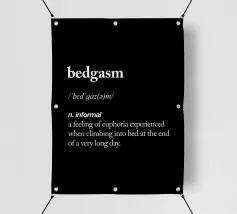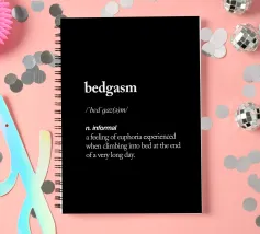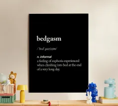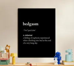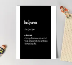 Concedetevi il massimo del comfort con la nostra spiritosa stampa tipografica "Bedgasm". Questo design intelligente presenta una definizione umoristica in stile dizionario con un testo serif bianco e nitido su un elegante sfondo nero. Perfetta per l'arredamento della camera da letto o come regalo per gli amanti del sonno, cattura la sensazione di beatitudine che si prova quando si sprofonda nel letto dopo una lunga giornata. Il contrasto netto e lo stile tipografico formale creano un pezzo di grande impatto visivo, divertente ed elegante. Disponibile su diversi prodotti, questo design versatile aggiunge un tocco di umorismo al vostro spazio. Abbracciate il vostro amore per il sonno!