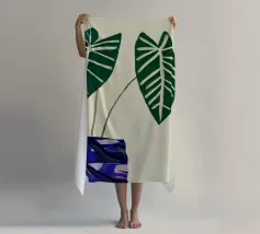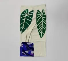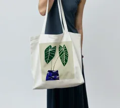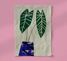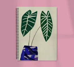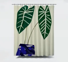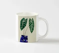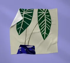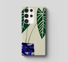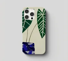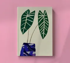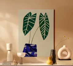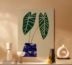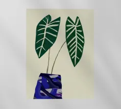 Una coppia di foglie verdi stilizzate con venature bianche prominenti si estende da sottili steli marroni. Emergono da un vaso con motivi blu e viola, creando una rappresentazione moderna e semplicistica di una pianta in vaso.