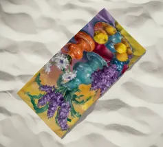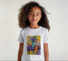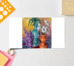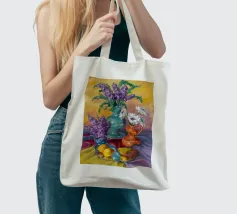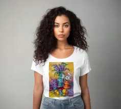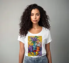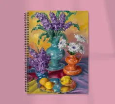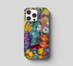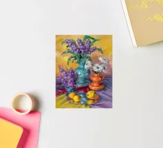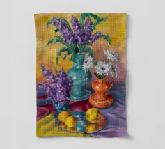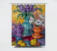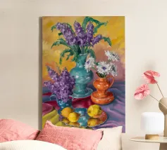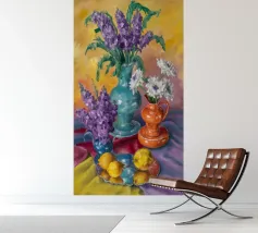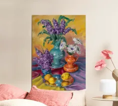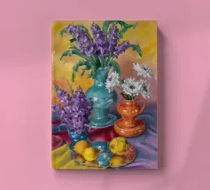 Una natura morta riccamente colorata mette in mostra un vibrante bouquet di lavanda viola e margherite bianche in una brocca blu, accanto a una brocca arancione più piccola e a limoni gialli brillanti su una superficie drappeggiata viola su uno sfondo giallo-arancio caldo, creando una composizione audace e gioiosa.