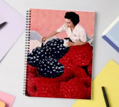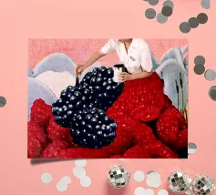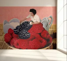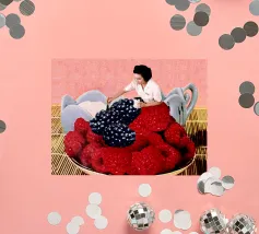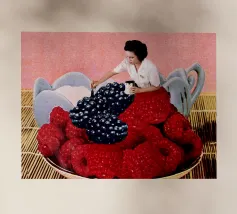 Donna che dipinge di nero i lamponi per farli sembrare more perché ha sbagliato l'ordine del brunch. Collage vintage divertente e surreale di MsGonzalez ispirato alla colazione