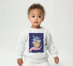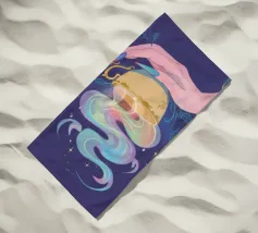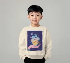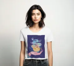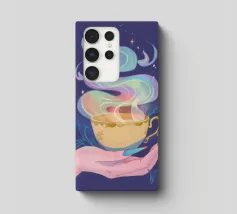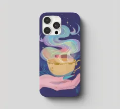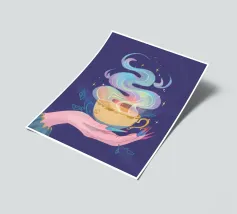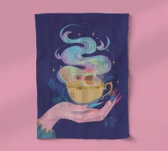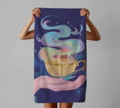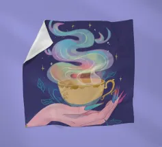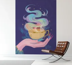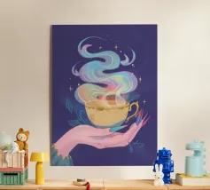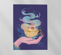 Questa opera d'arte mostra una mano che tiene in mano una tazza da tè gialla con vapore vorticoso. Lo sfondo è scuro con elementi mistici, che creano un senso di incanto e mistero.