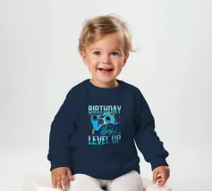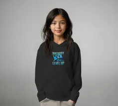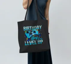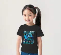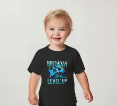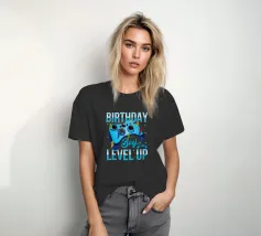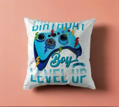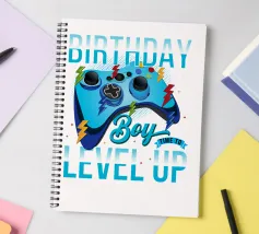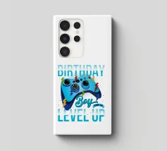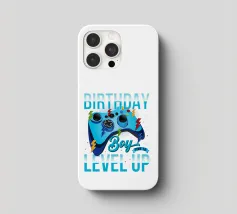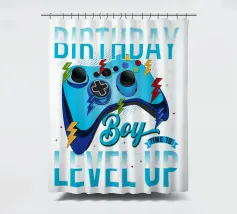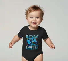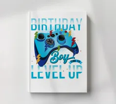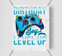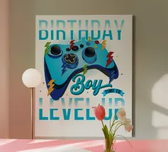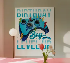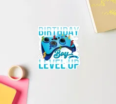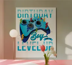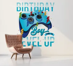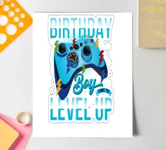 Un controller di gioco blu circondato da fulmini colorati è al centro del disegno, che riporta la frase "Birthday Boy, Time to Level Up".