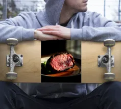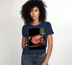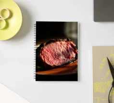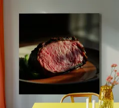 Un succulento pezzo di bistecca di media cottura poggia su un piatto scuro, mettendo in mostra il suo interno rosa e lo strato esterno grigliato. Guarnito con erbe fresche, questo piatto evidenzia la maestria culinaria.