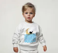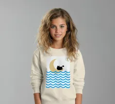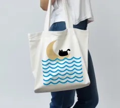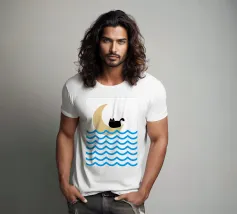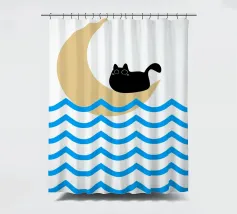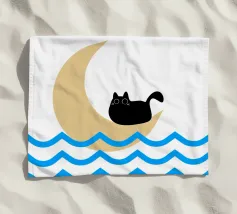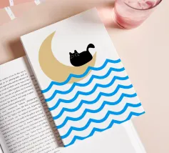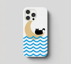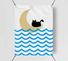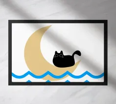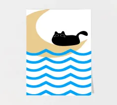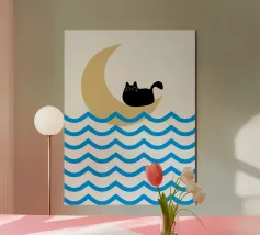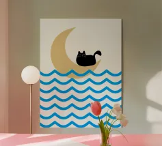 Un gatto nero siede in cima a una mezzaluna, fluttuando sopra una serie di linee blu ondulate che ricordano l'oceano. Il design minimalista utilizza colori vivaci per creare una scena stravagante e surreale.