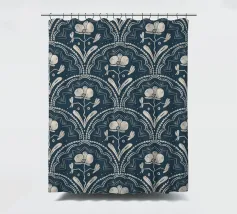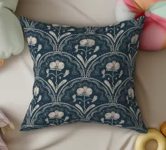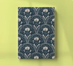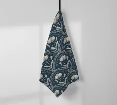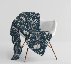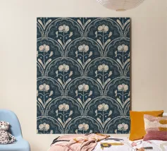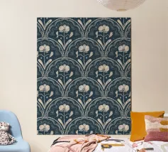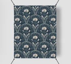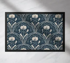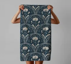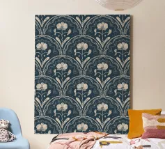Motivo bohémien di piastrelle botaniche in beige e blu scuro.