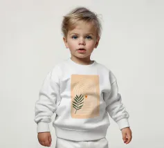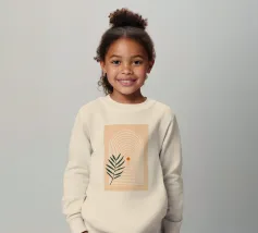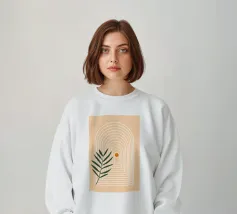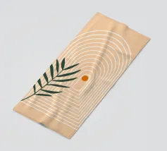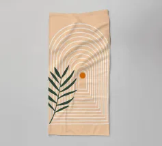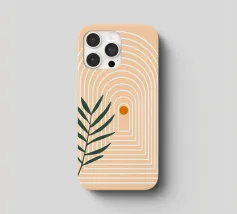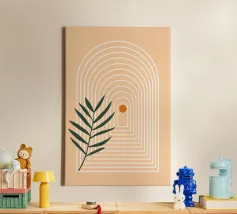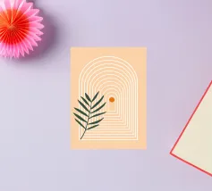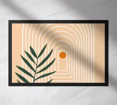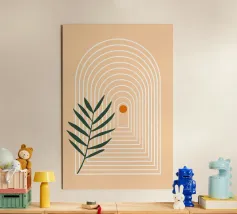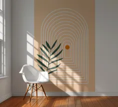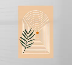 Un poster minimalista e moderno che combina forme naturali organiche con una geometria chiara. Al centro, una serie di archi rotondi bianchi e intrecciati che si estendono in profondità come un tunnel e conferiscono al disegno un forte effetto spaziale. Al centro si illumina un piccolo cerchio arancione, simbolo del sole, dell'energia o dell'equilibrio interiore. In primo piano, una foglia verde scuro con rami sottili contrasta con il rigore geometrico degli archi. Questo gioco di natura e struttura crea un equilibrio armonioso tra calma e dinamismo.
