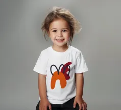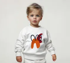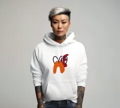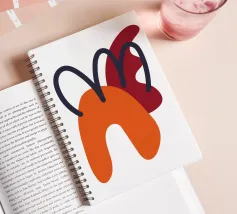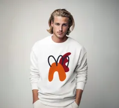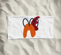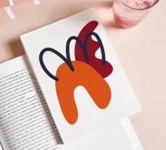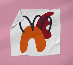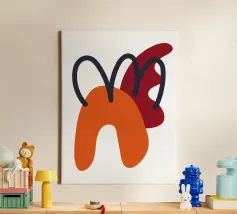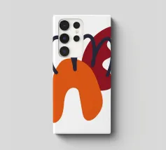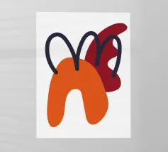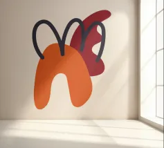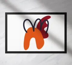 Forme astratte e audaci in arancione e rosso si combinano con linee curve nere, creando un design moderno e giocoso. La composizione presenta elementi sovrapposti che aggiungono profondità e interesse visivo.