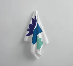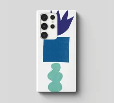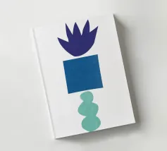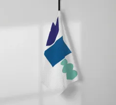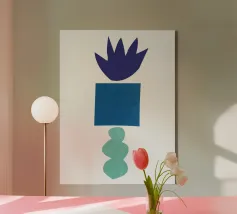 Forme geometriche audaci sono impilate verticalmente con colori distinti, tra cui una forma a spillo blu scuro in alto, un quadrato blu al centro e una forma organica verde chiaro in basso. La composizione complessiva dà un'impressione moderna e astratta