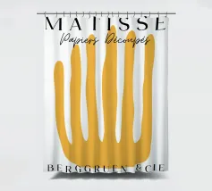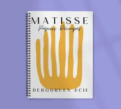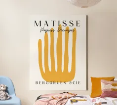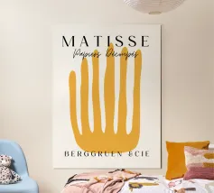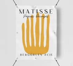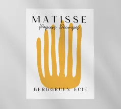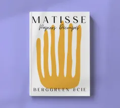 Un'audace forma gialla che assomiglia a dita allungate è centrata su uno sfondo bianco, accompagnata da un testo in elegante tipografia. Il disegno sembra pubblicizzare una mostra o un evento legato ai ritagli di carta di Henri Matisse.