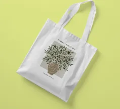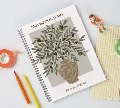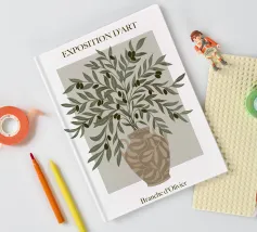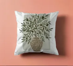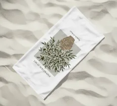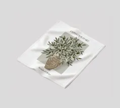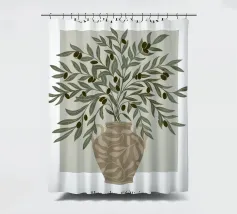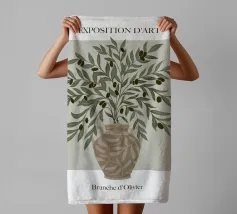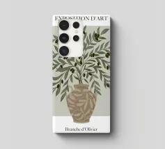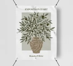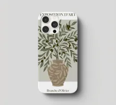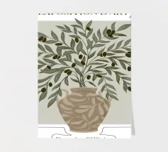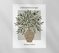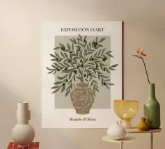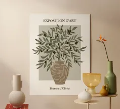 Arte murale botanica in beige e verde salvia, un bouquet di rami d'ulivo riposa in un vaso bohémien color crema su sfondo bianco. Crea un ambiente calmo e sereno che aggiunge profondità alle vostre pareti.