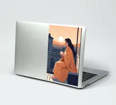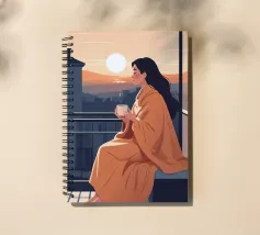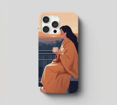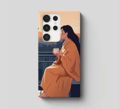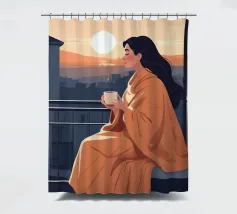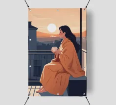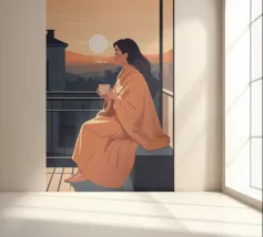 Un'illustrazione serena di una donna avvolta in una coperta, che sorseggia una bevanda calda guardando il tramonto dal suo balcone. Tranquilla, accogliente e piena di morbida luce dorata.