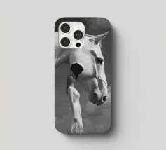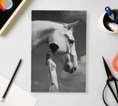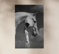 Un'immagine surreale in bianco e nero di una donna in abito di pizzo che si trova di fronte a una gigantesca testa di cavallo con texture screpolate, che crea un'atmosfera onirica e stimolante in un cielo nuvoloso.